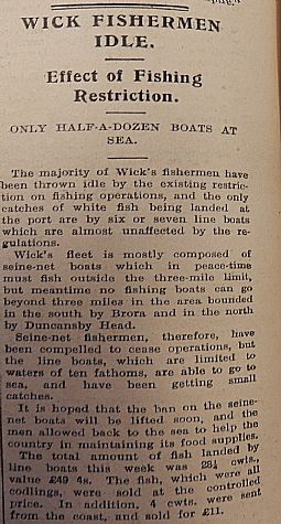 As predicted by the Wick Harbour Trust back in the first week of the war, the port’s fishing fleet was badly affected by the new wartime restrictions. Most of the boats used seine nets, and in peace time fished out in the open ocean; but now the authorities had placed a ban on fishing beyond a three-mile limit around the coasts from Duncansby Head to Brora. The majority of the fleet was therefore compelled to sit idle in port, except for seven or eight line boats which were limited to waters of just ten fathoms.